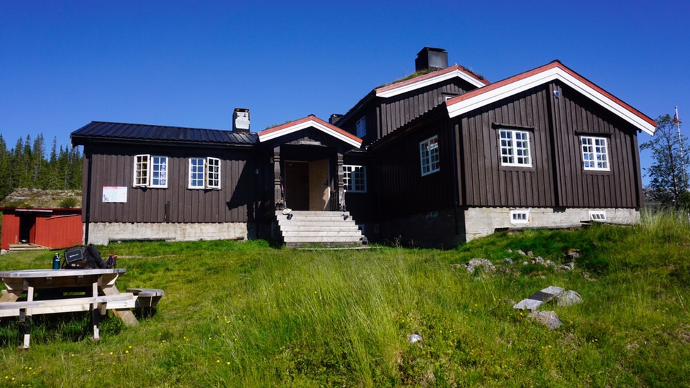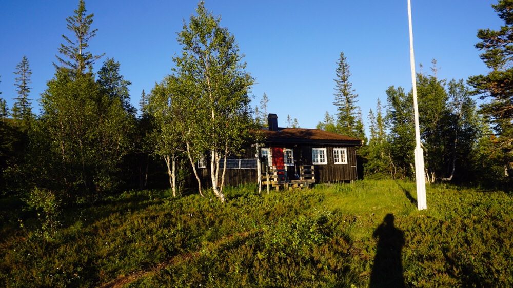 Dem ist dann auch so und ich sehe die Fahne des Trondhjems Turistforeningen über den Bäumen wehen. Ich setzte den Rucksack ab, schliesse die Tür auf und schaue mich in der Hütte um. Sie ist jetzt keine der schönsten DNT Hütten, aber für den Abend reicht sie mir.