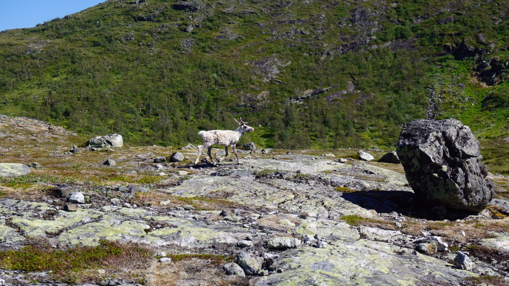 Dann folge ich dem Wegweiser hinauf in das Fjell. Es geht nun für drei Tage durch das Skarvan og Roltdalen, wovon zwei Tage den kleinen Nationalpark beinhalten. Ich freue mich schon darauf.