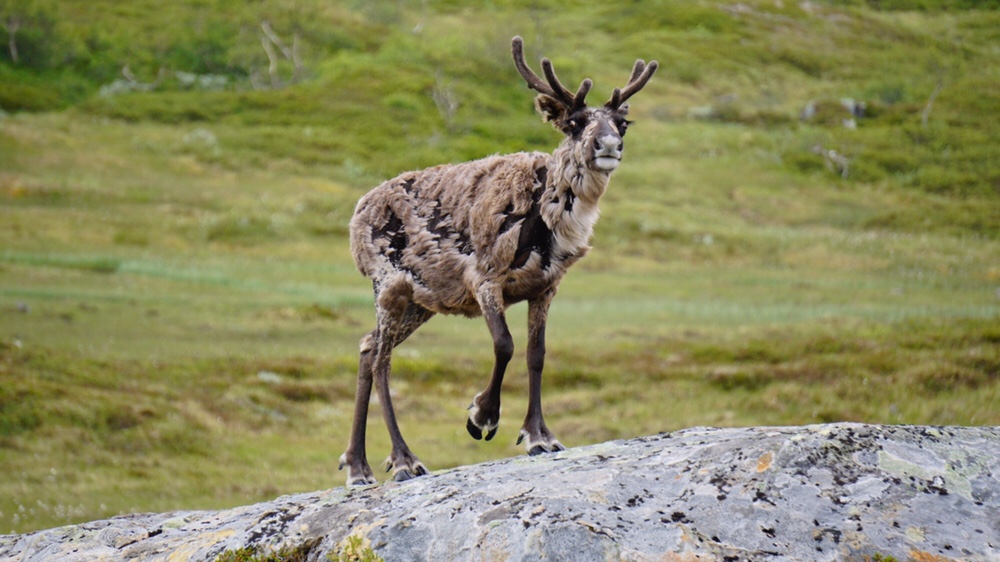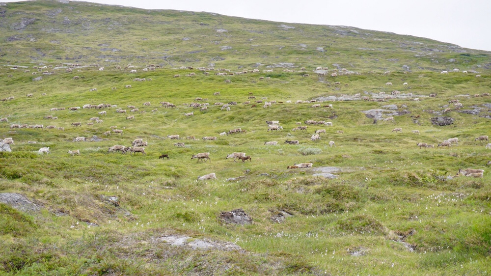 Überall um mich herum laufen kleinere Gruppen von Rentieren. Sie gehören den Sami und tragen fast alle Halsbänder und sind gechipt.