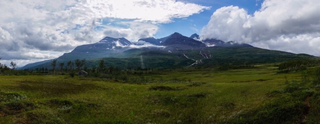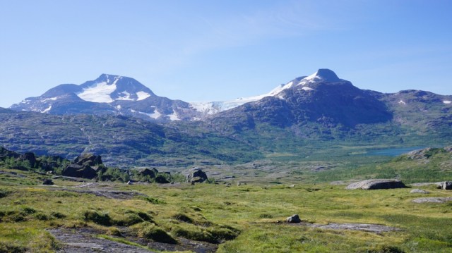 Ich kauer mich hinter einen Felsen und lasse die Front durchziehen. Keine zehn Minuten später klart es auch schon wieder auf und ich setze meinen Weg zur Gressvasshytta fort. Mein Weg führt mich weiter hinunter ins Tal und an der Balskota mache ich nochmals Pause. Dann geht es zum Endspurt. Um das Okstindanklart es nun richtig auf und die Gipfel und Gletscher kommen zum Vorschein. Dieses Massiv ist noch beeindruckender als ich es mir immer vorgestellt habe.