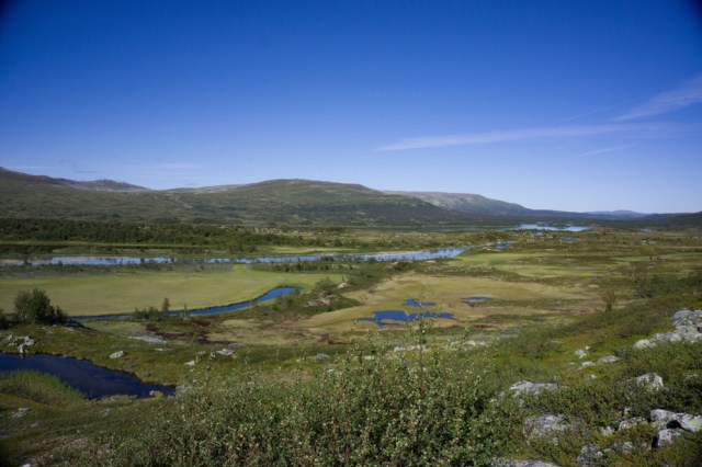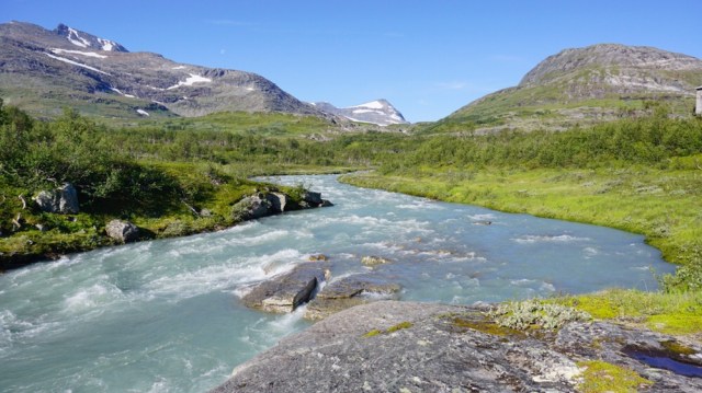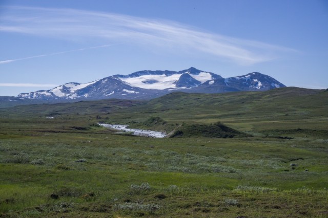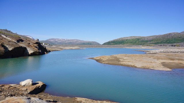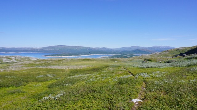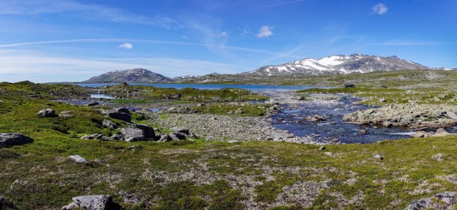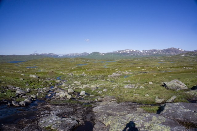 Zwischenzeitlich muss ich immer an Martin Kettler denken, wie er hier Anfang Juli 2015 auf seiner Norge på langs Tour durch ist und das Fjell noch komplett zugeschneit war und die Bächlein die ich gerade überquere reissende Ströme unter instabilen Schneebrücken waren. Ich kann mir die Situation gar nicht wirklich vorstellen, schwitze ich doch schon seit meinem Start in Lindesnes bei fast 25-28 Grad täglich.