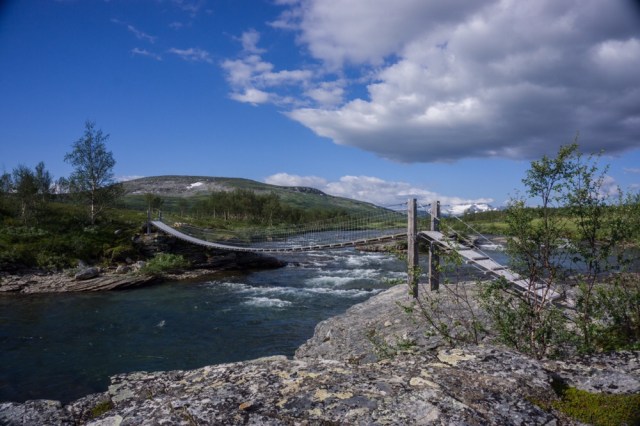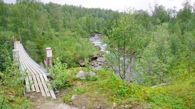 Dann mache ich mich auf den Weg ins Susendalen. Ich laufe weiterhin weglos durch die Sumpf und Birken Landschaft und komme nach zwei Stunden zur Hängebrücke über die Tiplingelva und dem Ende des Børgefjell Nationalparks. Ab hier führt mich nun ein Pfad über das Susenfjellet hinunter in das Susendalen.