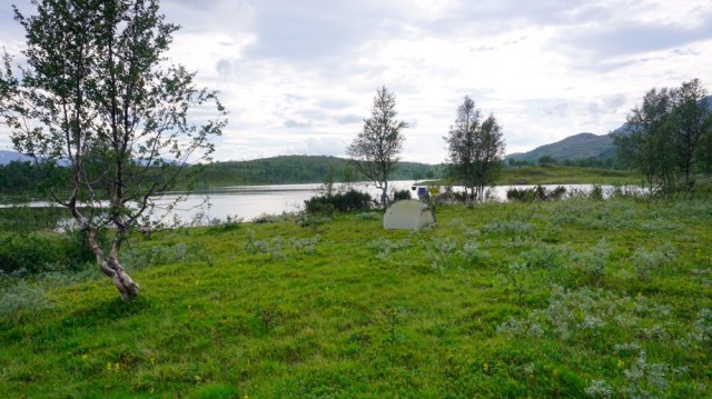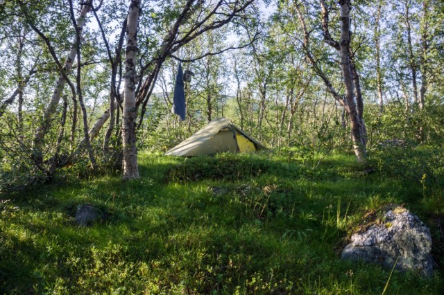 Für mich heisst es nun entlang des Hangs immer durch den Birkenwald zu laufen. Oder sollte ich sagen mich zu kämpfen. Denn einen Weg gibt es hier nicht und so sind die letzten Kilometer etwas beschwerlich. Aber auf einem Hügel am Vestre Tiplingen finde ich einen Lagerplatz mit Frischwasser.