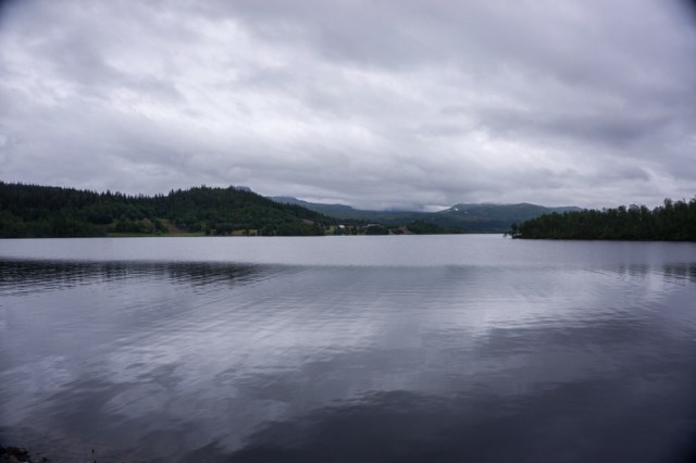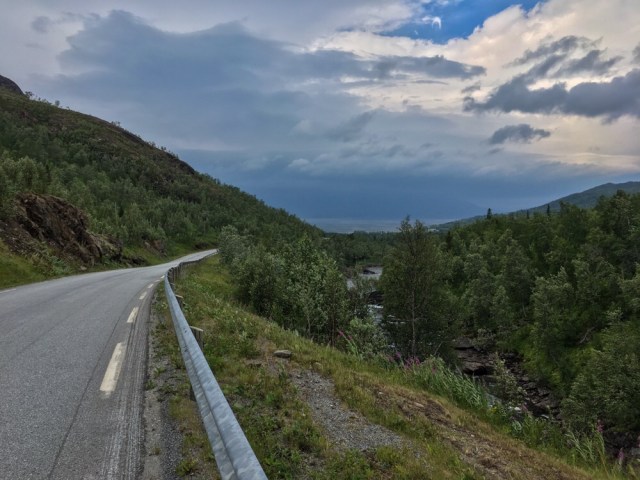 Um acht stehe ich dann schon an der Strasse und auf Anhieb hält ein Auto an und das auf einen Sonntag. Der netter Herr nimmt mich bis nach Hattfjelldal mit. Dann geht es entlang der Strasse bis zum Krutvatnet. Die Strasse zieht sich ewig dahin. Am Røssvatnet mache ich eine ausgedehnte Pause auf einem Rastplatz. Es schüttet gerade wie Eimern und ich bin froh das es erst angefangen hat als ich hier angekommen bin.