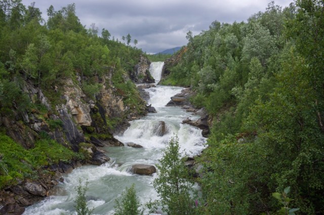 Ich mache mich fertig und ziehe in weiser Voraussicht die Regenhose an. Für heute sind Gewitter angesagt. Um zehn Uhr stehe ich an der Treppe zum Wanderweg und schulter den Rucksack. Mein Weg führt mich zunächst über Felder und dann in Wald hinein. Zu meiner linken stürzt sich tosend die Spjeltfjellelva einen Wasserfall hinunter.