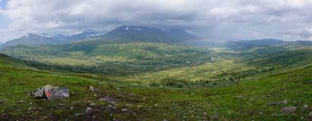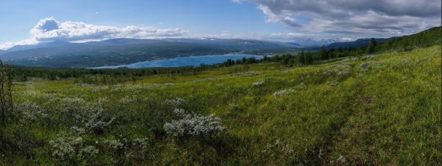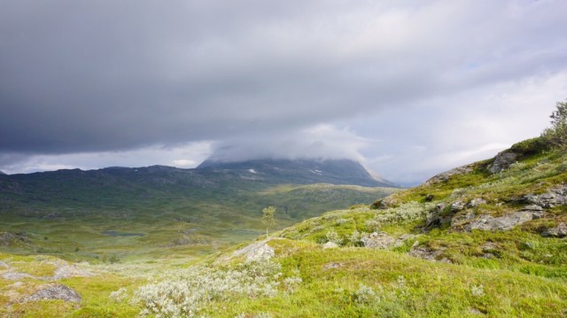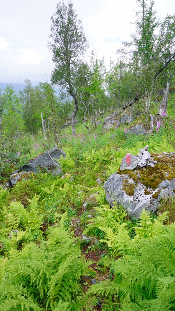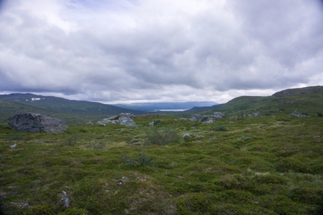 Die ersten Kilometer sind ein einziges auf und ab durch Birkenwald und nicht mehr gut zu erkennbaren Markierungen. Auch weiter oben im Fjell ist es nicht wirklich besser. Ständig verliere ich den Weg aus den Augen und muss die verdammten Steinmännchen suchen. Teilweise sind sie einfach zugewuchert oder umgefallen. Wer auch immer hier für den Weg verantwortlich war muss wohl schon lange das zeitliche gesegnet haben.