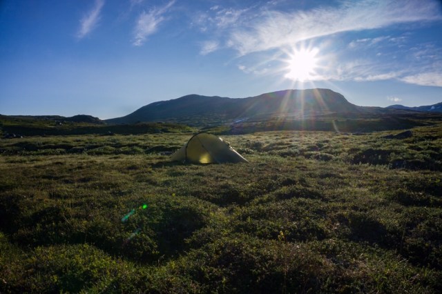 Dann steht nochmal ein ordentlicher Anstieg an und es geht zur Hochebene rauf. Irgendwo hier oben in der Nähe des Gaukarvatnet will ich mein Lager aufschlagen und nach etwas suchen finde ich eine ebene Stelle an einem Bachlauf. Ich baue das Zelt auf und koche mir noch etwas, dann falle ich fast in meinen Schlafsack.
