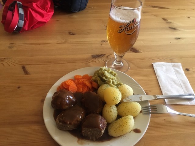 Das lasse ich mir nicht zweimal sagen und ich packe meine Sachen in das Stabbur und gehe duschen. Die Dusche ist nach diesem Tag ein echter Traum. Das ganze wird nur noch von dem hervorragenden Essen und dem kalten Bier übertroffen.