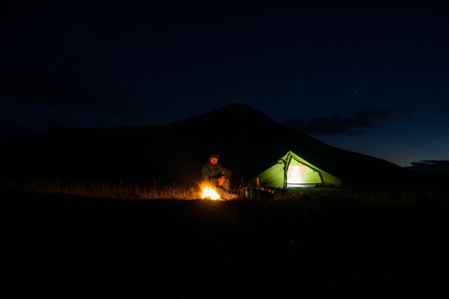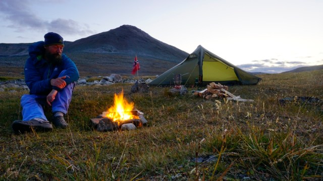 Am Ende des Tales steht die Kuonjarjoki wo ich den Tag beschliessen möchte. Es ist bereits nach 18 Uhr. Unterhalb der Hütte finde ich direkt am Bach einen schönen Lagerplatz und baue mein Zelt auf. Als es anfängt zu dämmern hole ich mir noch Holz aus dem Schuppen und bereite ein kleines Lagerfeuer vor. Darauf habe ich mich die ganze letzte Zeit schon gefreut und so sitze ich in der einsetzenden Dunkelheit vor meinem Zelt und geniesse den Abend am Feuer unter einem sternenklaren Herbsthimmel.