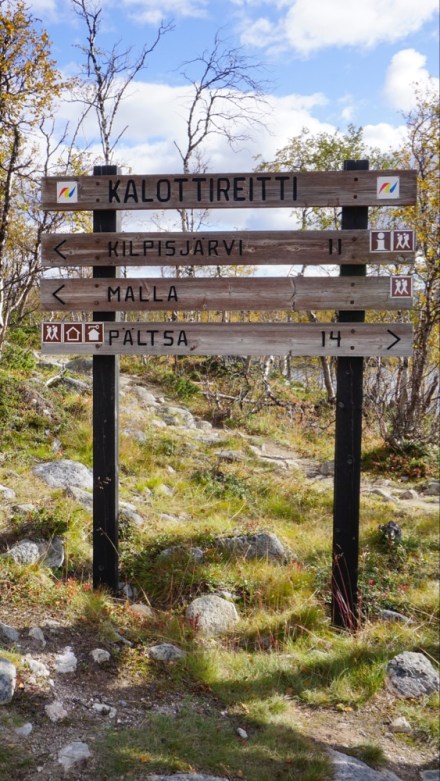 Aber nun heisst es weiter gen Norden. Das erste was einem nun bei den Wanderwegen auffällt ist die Beschilderung. Aus Nordkalottleden wird Kalottireiti und die Wegmarkierungen sind kleine Holzpfosten mit einem orangefarbenen Ende. Das wiederum ist manchmal sehr verblichen.