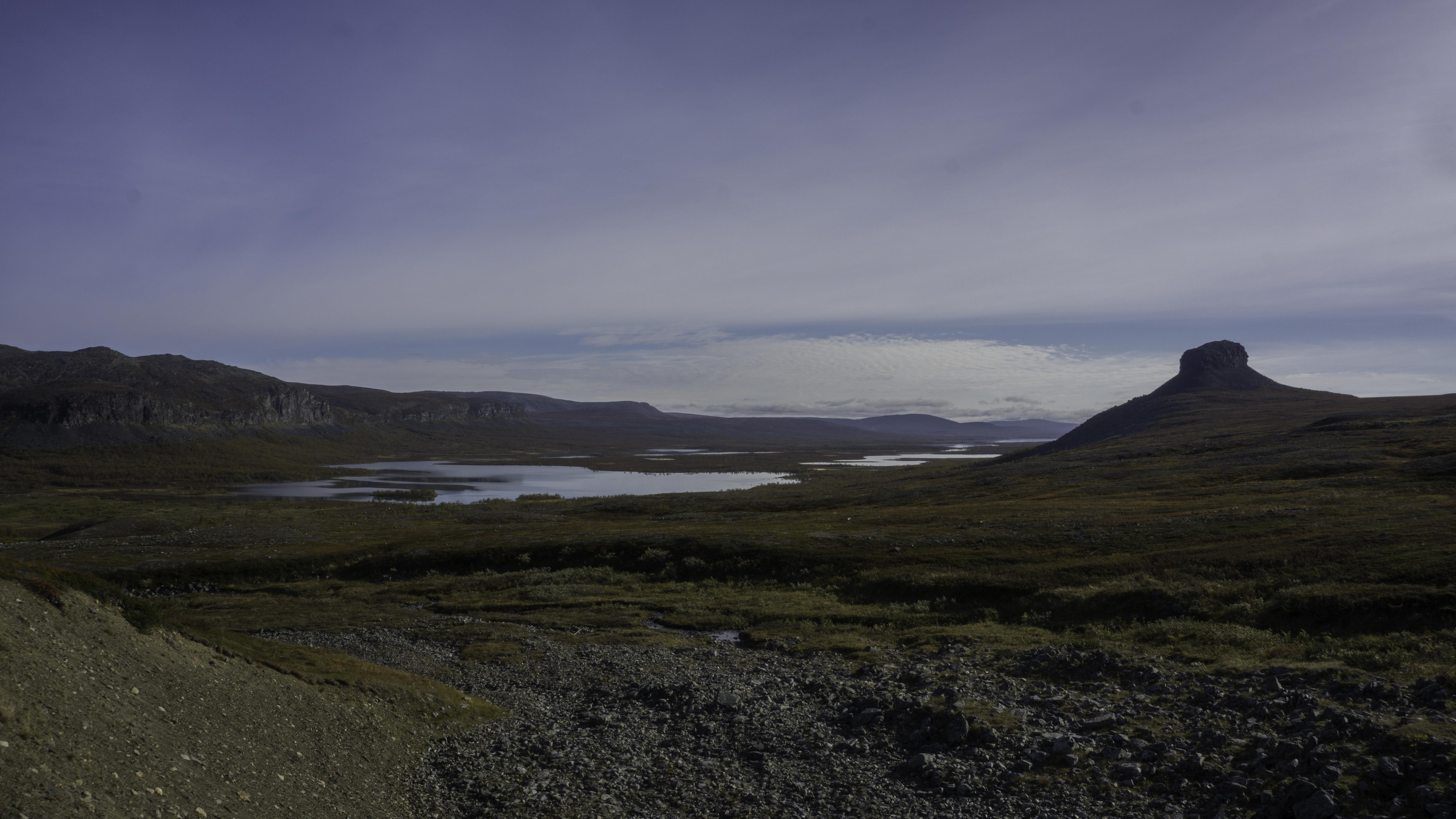 Am Bajit Oaggunjávri machen wir eine Pause und essen eine Kleinigkeit. Dann geht es weiter entlang des Mollejus und vorbei am Mollejusgobejávri. Wieder queren wir eine Quadspur. Weit vor uns ragt der Kegelförmige Gipfel des Rávdoaivi. Dorthin wollen wir es heute noch schaffen. Der Weg wird dann aber nochmal eine echte Qual. Ein Geröllfeld reiht sich an das nächste und am Abend finden wir dann unterhalb des Rávdoaivi einen brauchbaren Lagerplatz und stellen die Zelte auf. Es ist noch nicht einmal 20 Uhr als es in den Zelten ruhig wird.