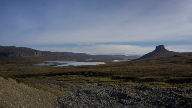 Nach der fast ein stündigen Pause geht es weiter durch das Tal. Der Weg ist nun durchsetzt mit Geröllfeldern durch die hier und da mal ein paar Planken gelegt sind. Aber die meiste Zeit heißt es nun über das Geröll balancieren. Sehr schnell verliere ich an diesem Teilstück den Spass, auch wenn es wieder einige fantastische Ausblicke gibt. Für die folgenden knapp vier Kilometer brauche ich fast zwei Stunden und mein gesamter Streckenfortschritt von heute morgen relativiert sich wieder. Na gut es ist gerade einmal früher Mittag und mein anvisiertes Tagesziel ist ja die Pitsusjärvi und die Hütte liegt nun auch nur noch etwa sieben Kilometer entfernt. Also eigentlich alles kein Problem. Aber das ganze Geröll nervt eben doch schon ziemlich.
