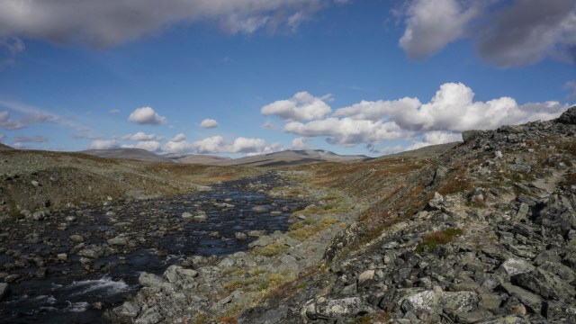 Der Weg zieht hinter der Hütte direkt bergan und ich arbeite mich entlang des Rassevaggi Tals den Berg hinauf. Die Landschaft hier ist staubtrocken und in den Flussbetten plätschern meist nur noch Rinnsaale. In der letzten Zeit dachte ich das Dividalen wäre trocken gewesen, aber Finnland übertrifft gerade alles. Hinzu kommt die Höhe von fast 1000 hm. In dieser Höhe wächst kaum noch etwas ausser ein paar Gräsern zwischen den Steinen. Und so hat diese Landschaft eher etwas von einem anderen Planeten, so wie man sich vielleicht den Mars vorstellt.