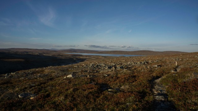 Dann komme ich auch schon zu den beiden Cahppesjävrrit Seen, die ich über eine schmale Landzunge passiere und folge dem Weg nun in das Goapmavarri Tal hinein. Der Weg schlängelt sich oberhalt der Goapmajohka durch entlose Geröllfelder. Von dem Weg hier hatte mir die Schweizerin berichtet. Der Weg soll laut ihrer Beschreibung nicht immer klar erkennbar sein, da die Pfosten mit den Markierungen dran ziemlich verblichen sein sollen. Tja was soll ich sagen, recht hat sie. Mehr als nur einmal bleibe ich stehen und suche den nächsten Holzpfahl nur um nach ein paar Minuten der Suche festzustellen das er entweder direkt vor mir oder neben mir ist. Das Gelände wird nun nach der hälfte der letzten Strecke auch besser zu laufen. Aber es wird auch Zeit das ich bald an der Hütte ankomme. Denn die Sonne steht schon sehr tief und wirft lange Schatten in die Landschaft.