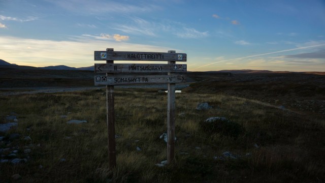 Der Weg verläuft sanft bergab und um 19 Uhr stehe ich vor der Hütte. Am Wegweiser bei der Hütte steht noch vier Kilometer bis zur Somashytta. Ich werfe einen Blick in die kleine finnische Hütte hinein und entschließe mich dann doch noch die letzten Kilometer bis nach Norwegen in Angriff zu nehmen. Ich will es heute noch bis zur Somas schaffen und morgen könnte ich schon im Reisadalen auf der Nedrefosshytta sein. Ich kann es gar nicht fassen das ich so weit gekommen bin! Nie hätte ich gedacht das ich es so weit schaffen würde. Emotional bin ich schon seit geraumer Zeit etwas nah am Wasser gebaut und bei solchen Momenten rollen immer wieder Freudentränen und die Emotionen fahren Achterbahn.