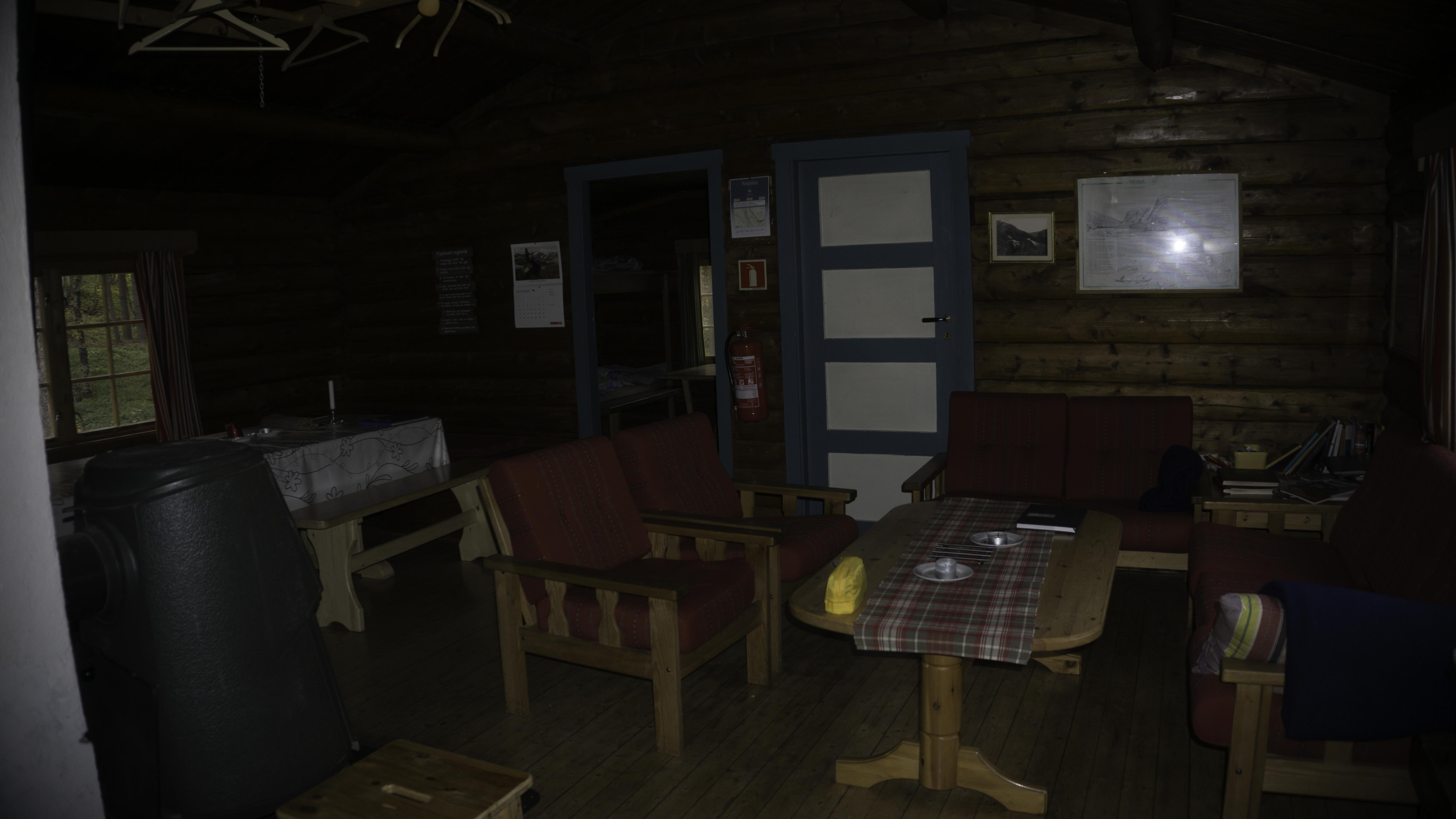 Die Somsashytta ist eine offene Statskoghütte die für jeden zugänglich ist. Neben Wanderern nutzen auch Samis und Jäger diese Hütte in regelmässigen Abständen. Das merk man schon vor betreten der Hütte. Draussen liegen überall Knochen und Geweihreste herum und im Vorraum hängt der Geruch von geschlachteten Wild. Die Hütte ist recht spartanisch ausgestattet. Es gibt eine Sitzmöglichkeit, einen Ofen und Betten. Eine Kochgelegenheit ist nicht vorhanden. Mit etwas Glück ist auch etwas gespaltenes Holz da. Am Servicegebäude gibt es zwar einen Hackklotz und drinnen liegen ein paar Sägen um die Stämme draussen zu bearbeiten, nur taugen die Sägen nicht mehr wirklich viel und ich hatte einige Mühen um mit dem riesigen Spalthammer überhaupt etwas Holz klein zu bekommen.
