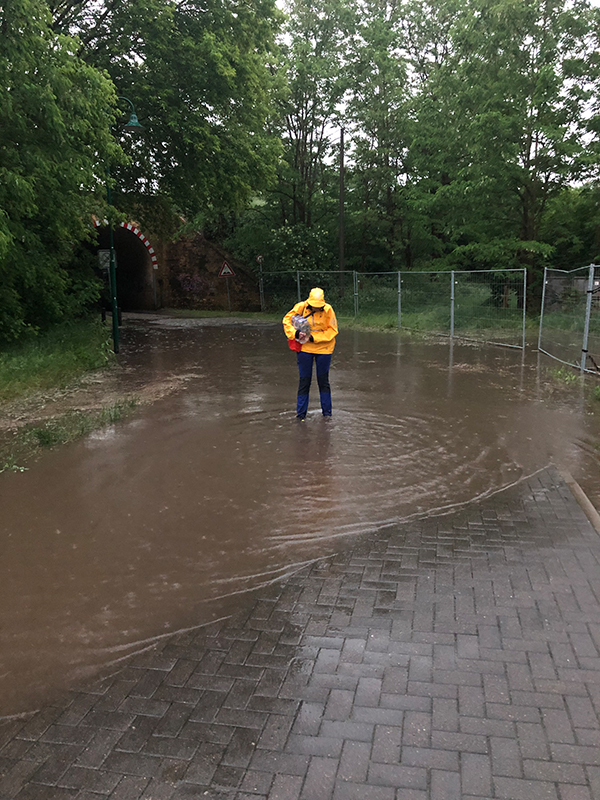 Die Luft wird langsam immer drückender und gerade am Netto angekommen fängt es an zu schütten. Mit unserer Einkaufstüte stehen wir nun unter dem Vordach des Ladens und warten den Regen ab. Aber es will einfach nicht aufhören. So langsam wie dieses Gewitter aufgezogen ist, so langsam zieht es auch vorbei. Also die Kaputzen auf und zurück zum Camping. Es regnet so kräftig, das kurz vor dem Camping die Strasse unter Wasser steht und der einzige Weg mitten hindurch führt.