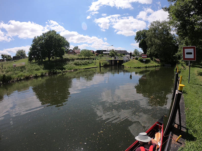 Morgens bauen wir das Ally auf und lassen das Zelt trocknen. Dann geht es an das beladen des Bootes und wir machen uns auf den Weg zu unserem ersten Etappenziel, der Schleuse Steinhavelmühle. Hier warten wir darauf das die Schleuse die ganzen Motorboote ausspuckt und wir einfahren dürfen.