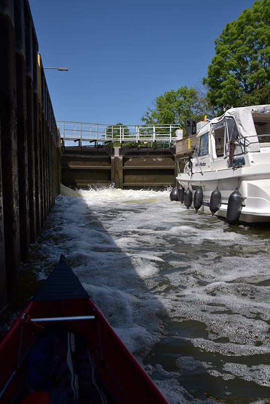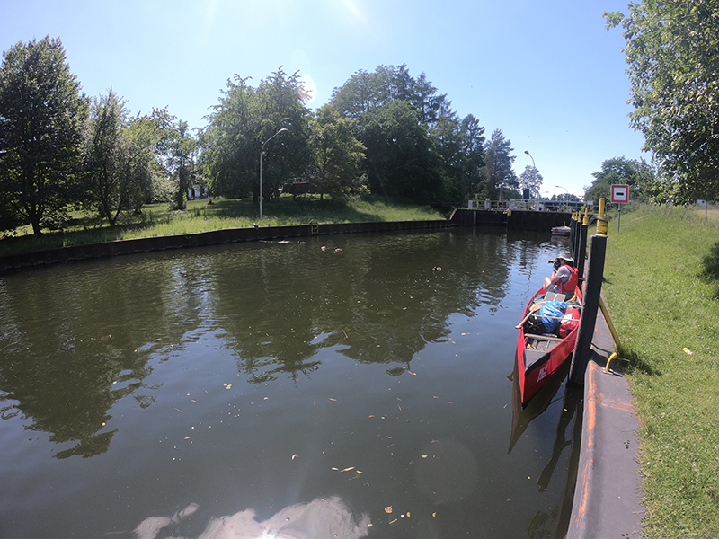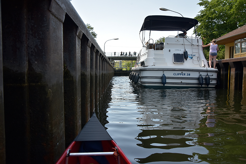 Üblicherweise fährt man mit Kanus soweit wie möglich nach vorne vor und wartet anschließend darauf das die Motorbetriebenen Boote in die Schleuse einfahren. Ganz zum Schluss fahren dann die Handbetriebenen Boote ein und machen dann im hinteren Teil der Schleuse, oder je nach Schleusenbreite auch neben den Motorbooten fest. Man wird auf jeden Fall immer vom Schleusenwärter eingewiesen und bekommt angezeigt wo man fest machen soll.