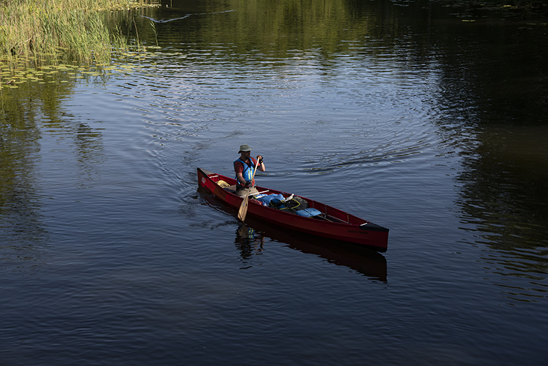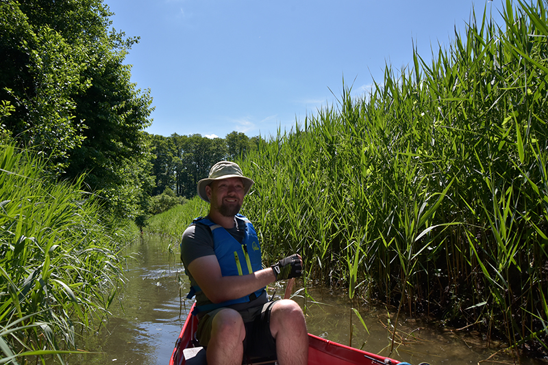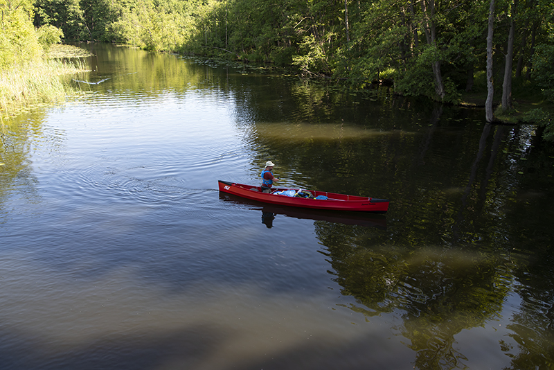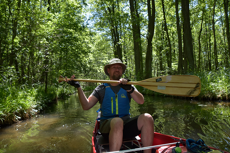 Es geht einmal der Länge nach über den See und an dessen Ende biegen wir in die Schwaanhavel hinein. Zu finden ist dieses kleine Fließ auch nur, da ihr Eingangsbereich mit Bojen markiert ist. Der Einstieg ist mit Strauchwerk und kleinen Bäumen zugewuchert und wir manövrieren uns langsam hindurch. Das Boot gleitet durch die engen Kurven und wir sind wirklich gerade allein hier und können die Ruhe genießen. Doch schon bald ist die paddelei vorbei. Der Wasserstand ist stellenweise so niedrig das ich aussteigen und das Boot ein ganzes Stück treideln muss. Das hatten wir hier so auch noch nicht. Meinen Spass habe ich allemal und nach etwas Wassertreten kann ich dann auch wieder einsteigen, da das Wasser wieder tiefer wird. Es geht durch dichten Wald und hier und da ragen tote Bäume in das Wasser oder überspannen das Fließ. Das hatten wir auch schon bei unserem letzten Besuch. Aber da waren wir mit Kajaks unterwegs und die ragen nicht so hoch aus dem Wasser. Jedoch passen wir an beiden Engstellen so gerade eben hindurch. Nach einer guten dreiviertel Stunde langsamen vor sich hin paddelns, treffen wir wieder auf die Schiffbare Havel und fahren weiter in Richtung Schleuse und Wesenberg. Hier liegt auch unser Tagesziel, die Kanumühle Wesenberg.