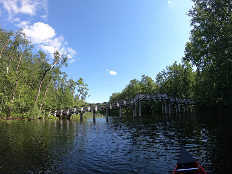 Das schöne an den Mecklenburger Gewässern ist, das hier kaum Strömung auf der Havel herrscht und man daher auch so wie wir Stromaufwärts in Richtung der Quellen fahren kann. So genießen wir auch wieder einmal die Passage hier im Bek und lassen uns teilweise einfach nur treiben. An einer Holzbrücke die über das Bek führt machen wir eine kurze Rast und genießen noch etwas die Aussicht aus leicht erhöhter Position. Dann machen wir uns auf die letzten paar Kilometer zum Campingplatz hinter uns zu bringen.
