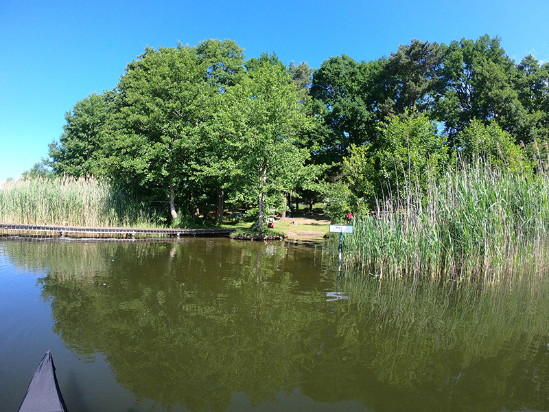 An der Brücke des Örtchens Kakeldütt gibt es einen kleinen Bootsanleger mit Schnellimbiss. Na ok, Kaffee und Kuchen gibt es auch, also legen wir an und machen ein kleines Päusken um uns zu stärken. Dann geht es weiter zur letzten Etappe des Tages. Ein Stück folgen wir noch der immer schmaler werdenden Havel, die hier in diesem Gebiet hoch bis Granzin nur eingeschränkt befahrbar ist. Nach etwas über 500 Metern folgt zur linken ein kleiner Stichkanal, dem wir nun in den Jamelsee und zum Campingplatz am Hexenwäldchen folgen. Der Kanal ist ordentlich verkrautet und führt kaum Wasser und wir kommen so gerade eben durch diesen hindurch. Nach gut 300 Metern sind wir im Jamelsee angekommen und nehmen Kurs auf den Strand des Campingplatzes.