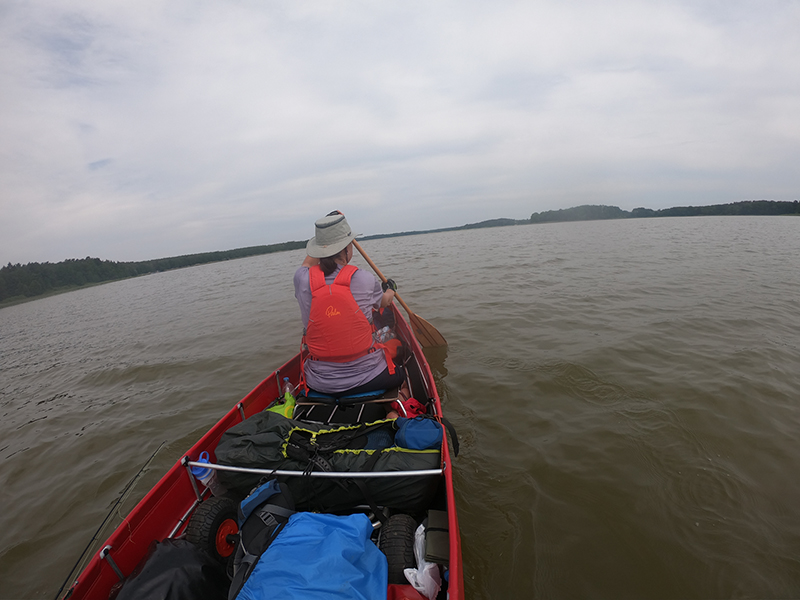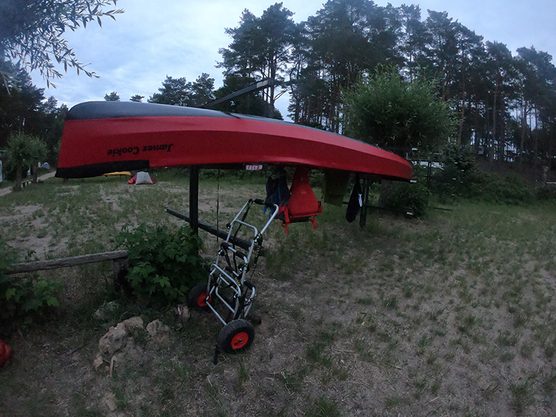 Als wir am nächsten morgen aus dem Zelt kriechen, begrüßt uns ein grauer Tag. Regen ist für heute angesagt und der Wetterbericht soll Recht behalten. Während Nadine beim Kiosk die bestellten Brötchen abholt, bringe ich schon einmal das Boot an den Strand und packe die ersten Sachen. Gegen halb elf sind wir auf dem Weg zu unserer letzten Etappe nach Kratzeburg. Es geht wieder zurück über den Jamelsee und den kleinen Stichkanal vom Vortag und dann weiter auf der Havel zum Jäthensee und nach Babke zur Bootsumtrage. Dort angekommen fängt es auch an zu schütten. Wir packen das Boot auf die Lore und fahren es zur Einsetzstelle. Dann schälen wir uns in die Regensachen.