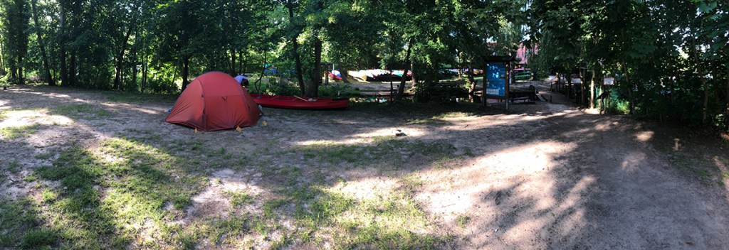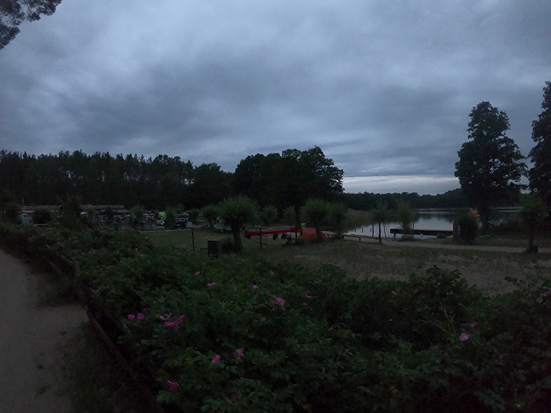 Am Abend erreichen wir bei aufziehenden Gewitter den kleinen Campingplatz am Röblinsee, den wir vorab angefragt hatten und der etwa 10 Gehminuten vom Bahnhof entfernt ist. Unsere Sachen lagern wir unter einer überdachten Rastbank und gehen erst einmal einkaufen. Es ist bereits kurz vor 19 Uhr und wir benötigen für die kommenden Tage noch etwas Proviant.