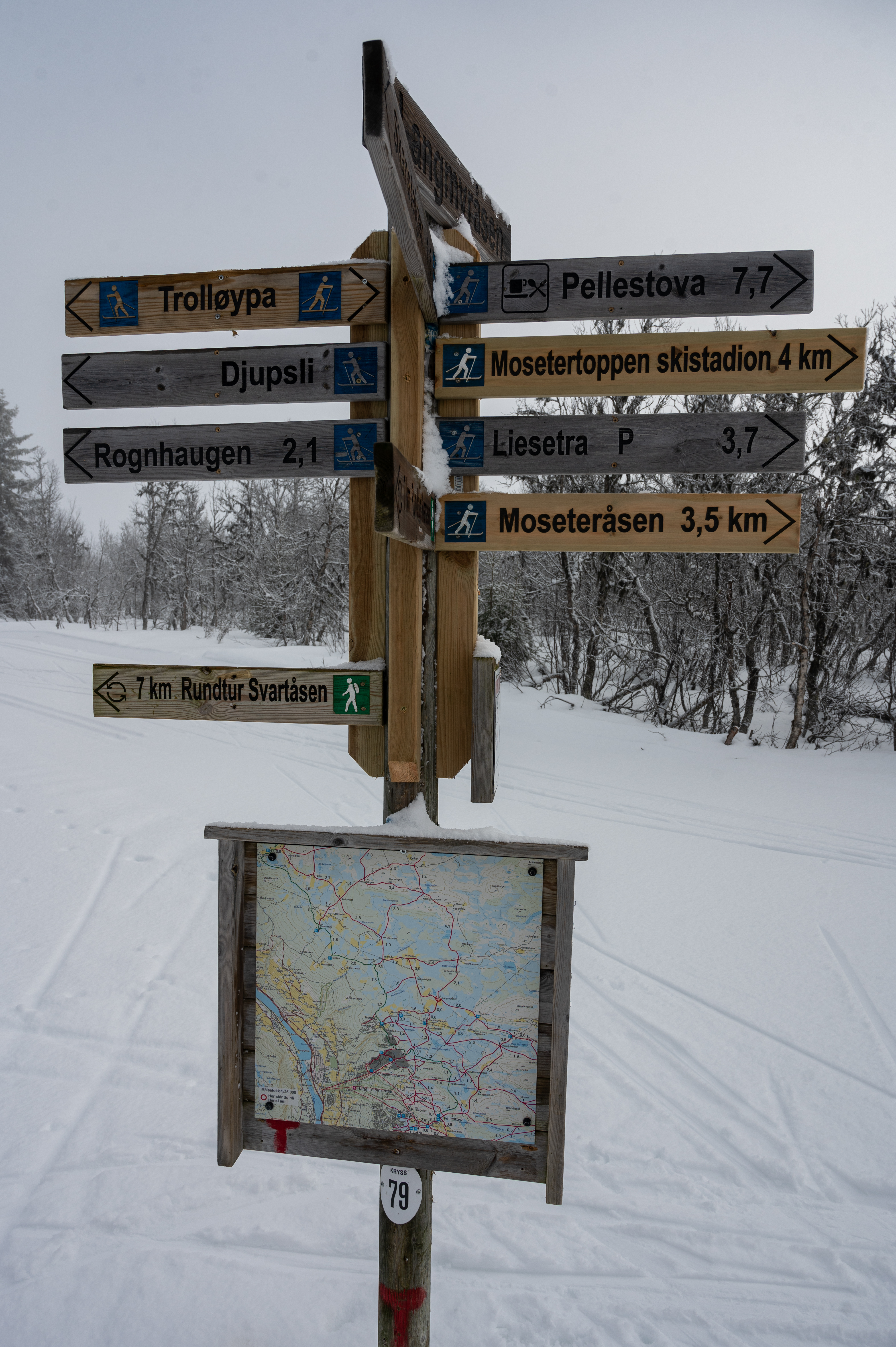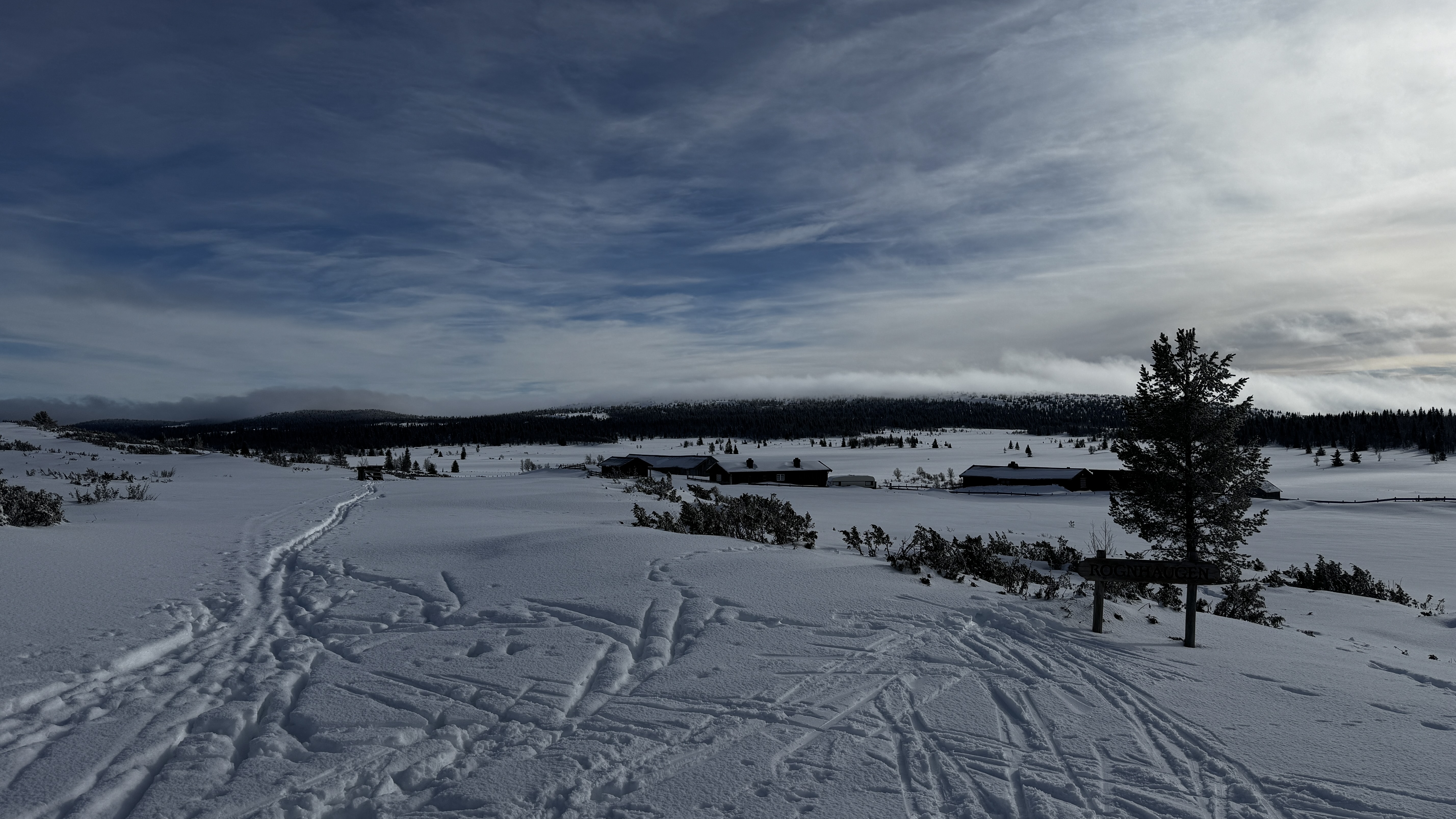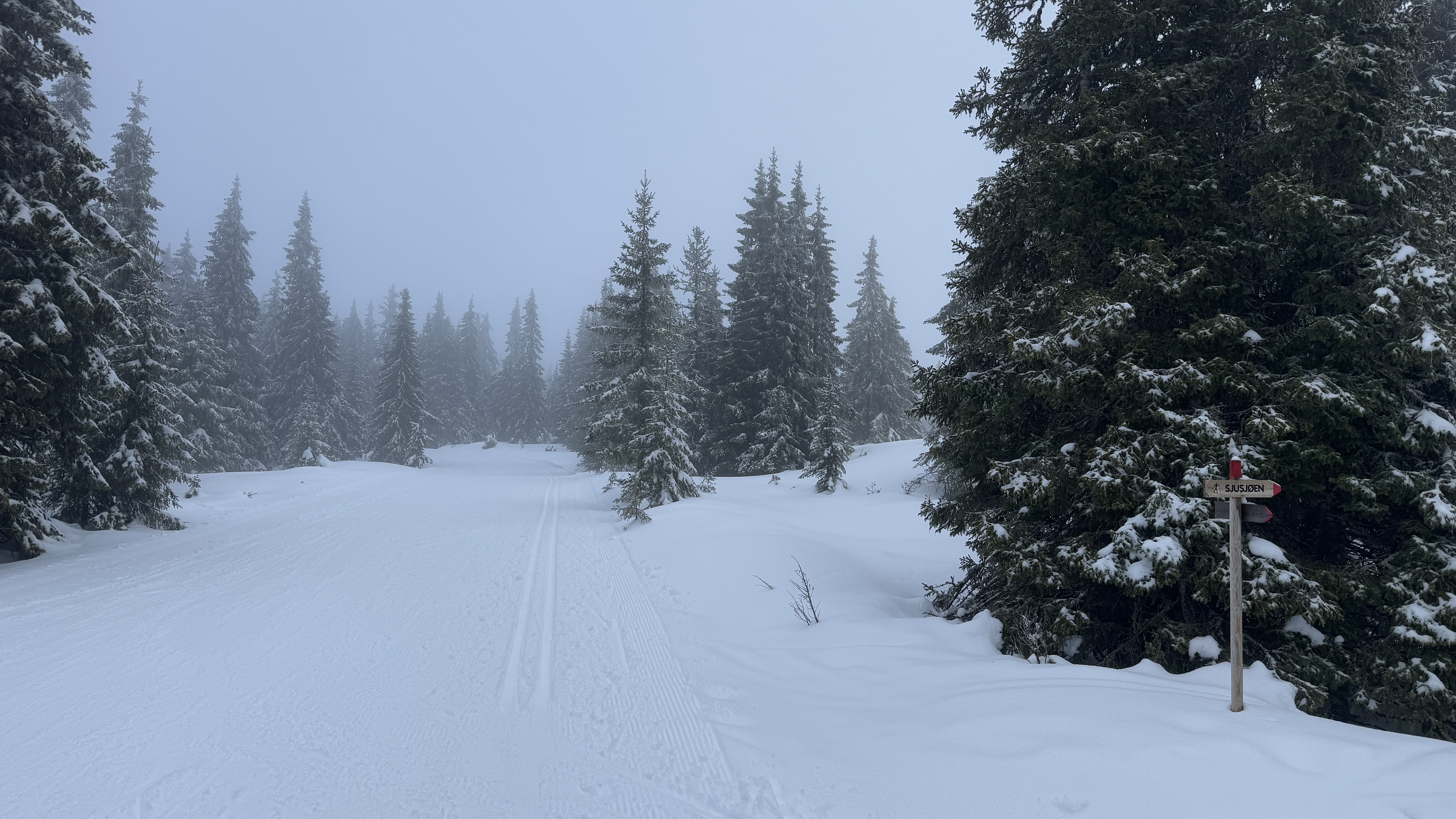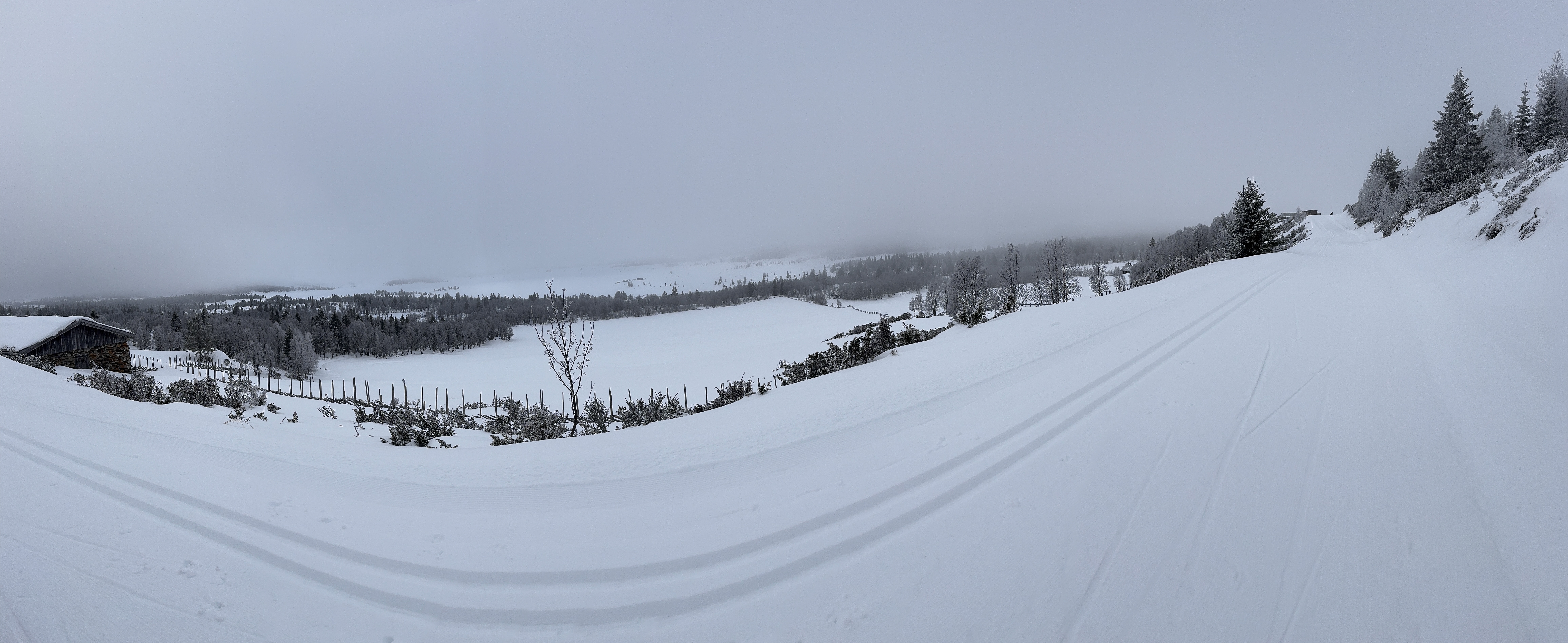 Ich setze mich wieder in Bewegung und folge dem Abzweig nach Rognhaugen. Es geht direkt zwischen ein paar Ferienhäusern den Berg hoch. Das Gelände wird ein wenig hügeliger und verlangt mir die nächsten dreieinhalb Kilometer einiges ab. Dann kommt der letzte Hügel hoch nach Rognhaugen. Ich stehe hier oben am Wegweiser, pfeife gefühlt aus dem letzten Loch und mache eine wohlverdiente Pause. Kurz vor mir sind zwei Langläufer angekommen, die sich, soweit ich es verstehe, über den Weg unterhalten. Ich schlürfe meinen Tee und genieße die Aussicht über das umliegende Gelände. Was mir auffällt, ist, wie wenig Schnee hier in diesem Jahr liegt. Aber das Gefühl hatte ich schon die ganze Zeit unterwegs. Und so sitze ich hier, krame mein Smartphone raus und suche Fotos aus 2020 von dieser Stelle.