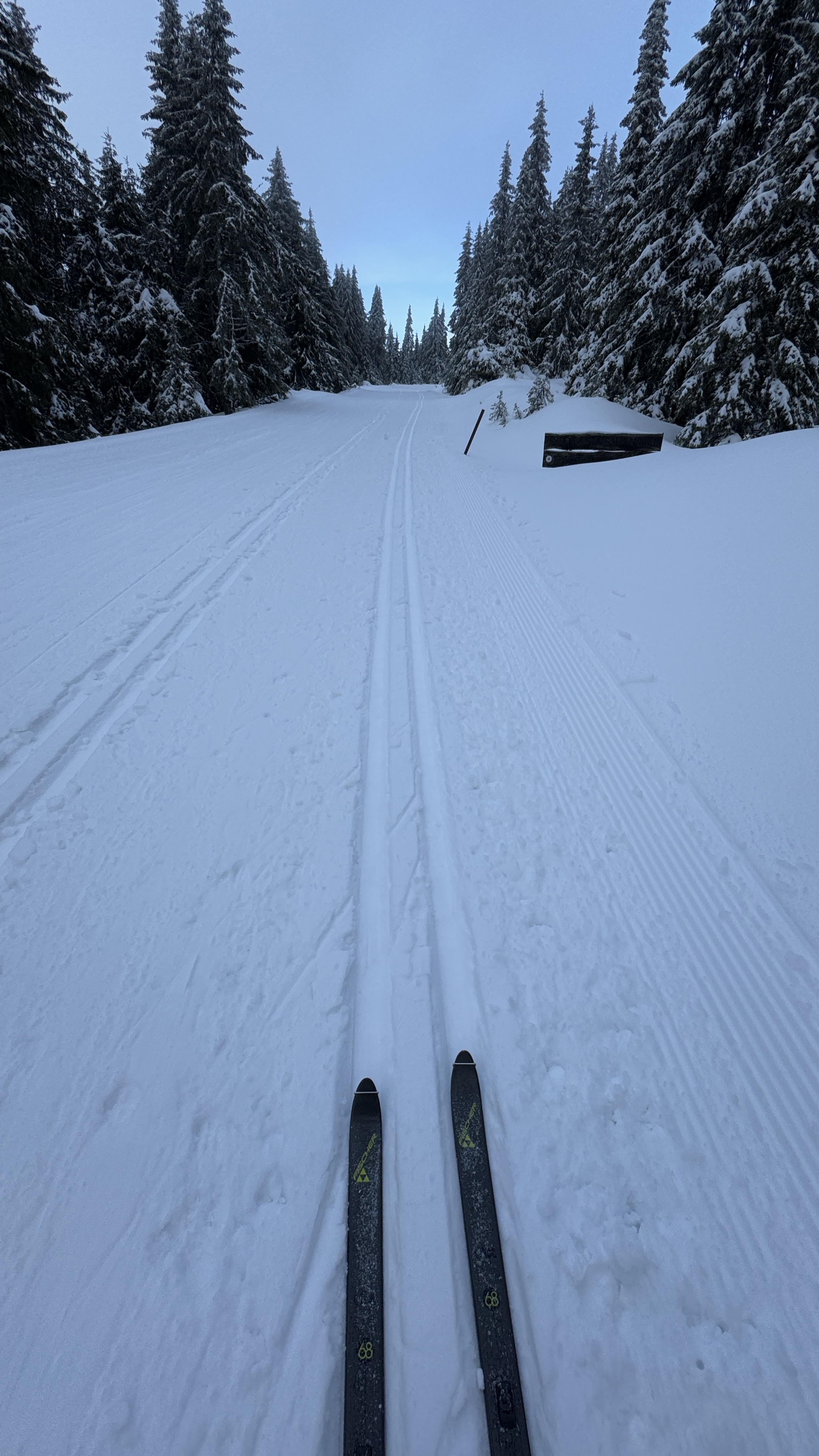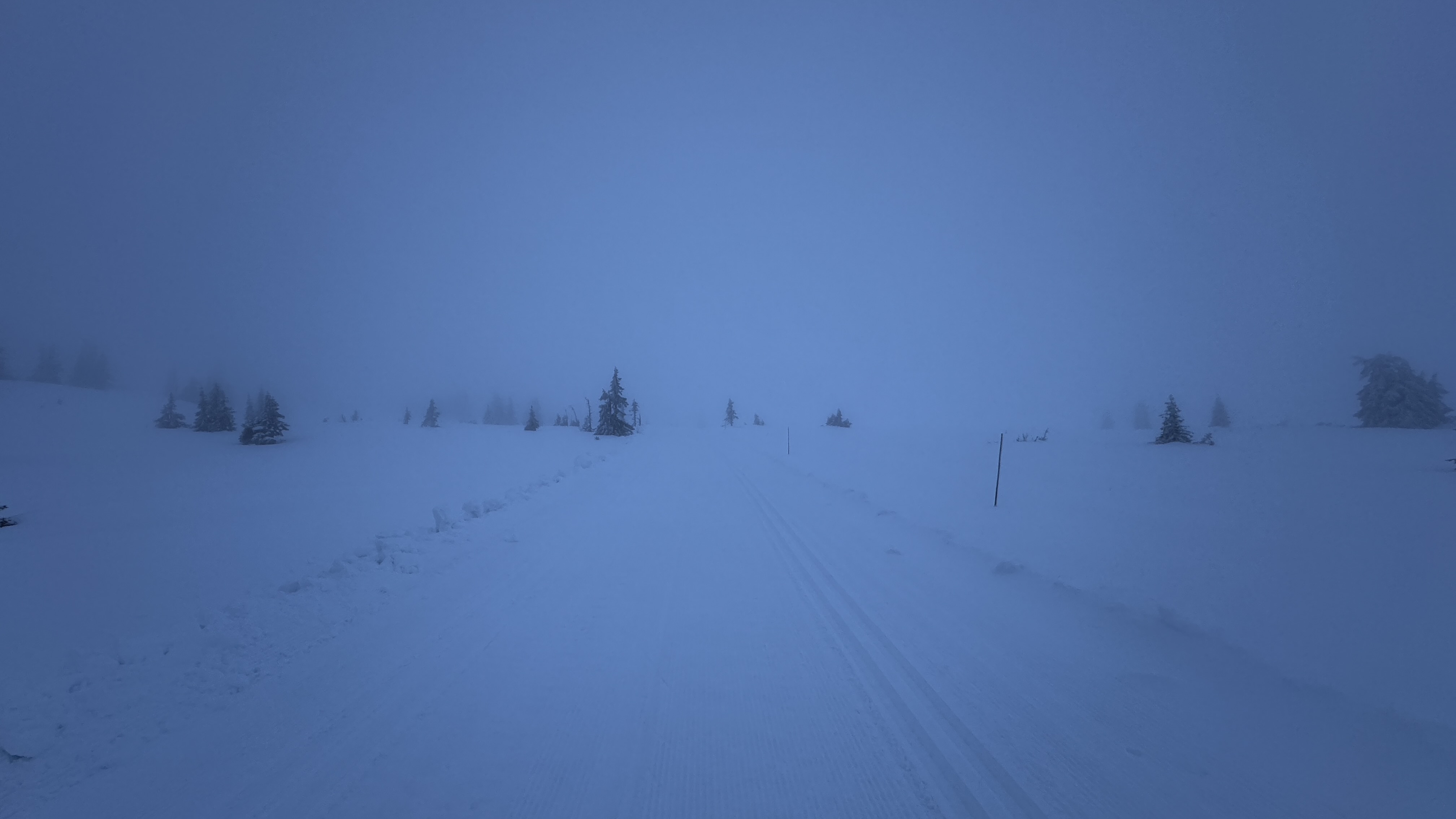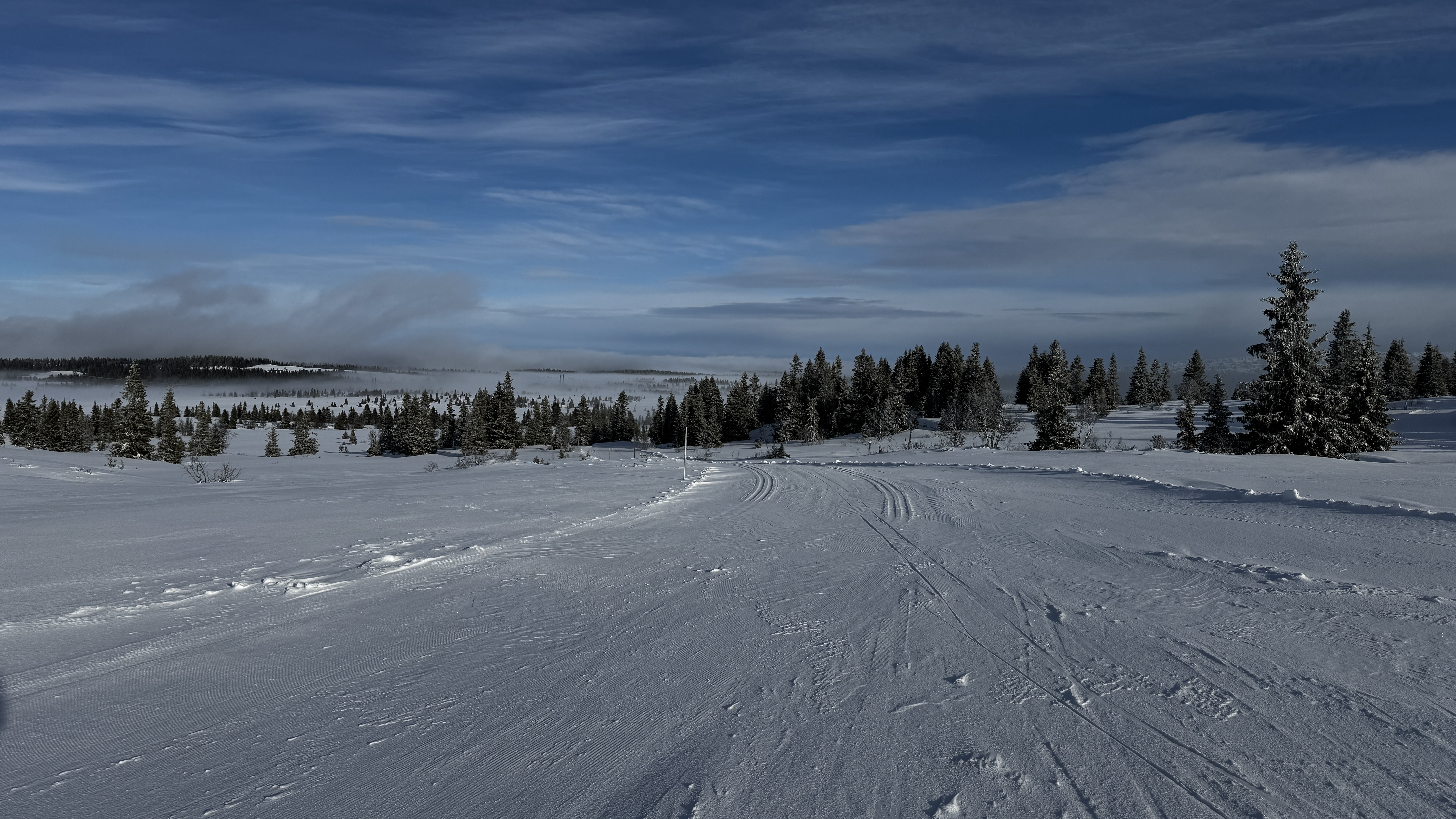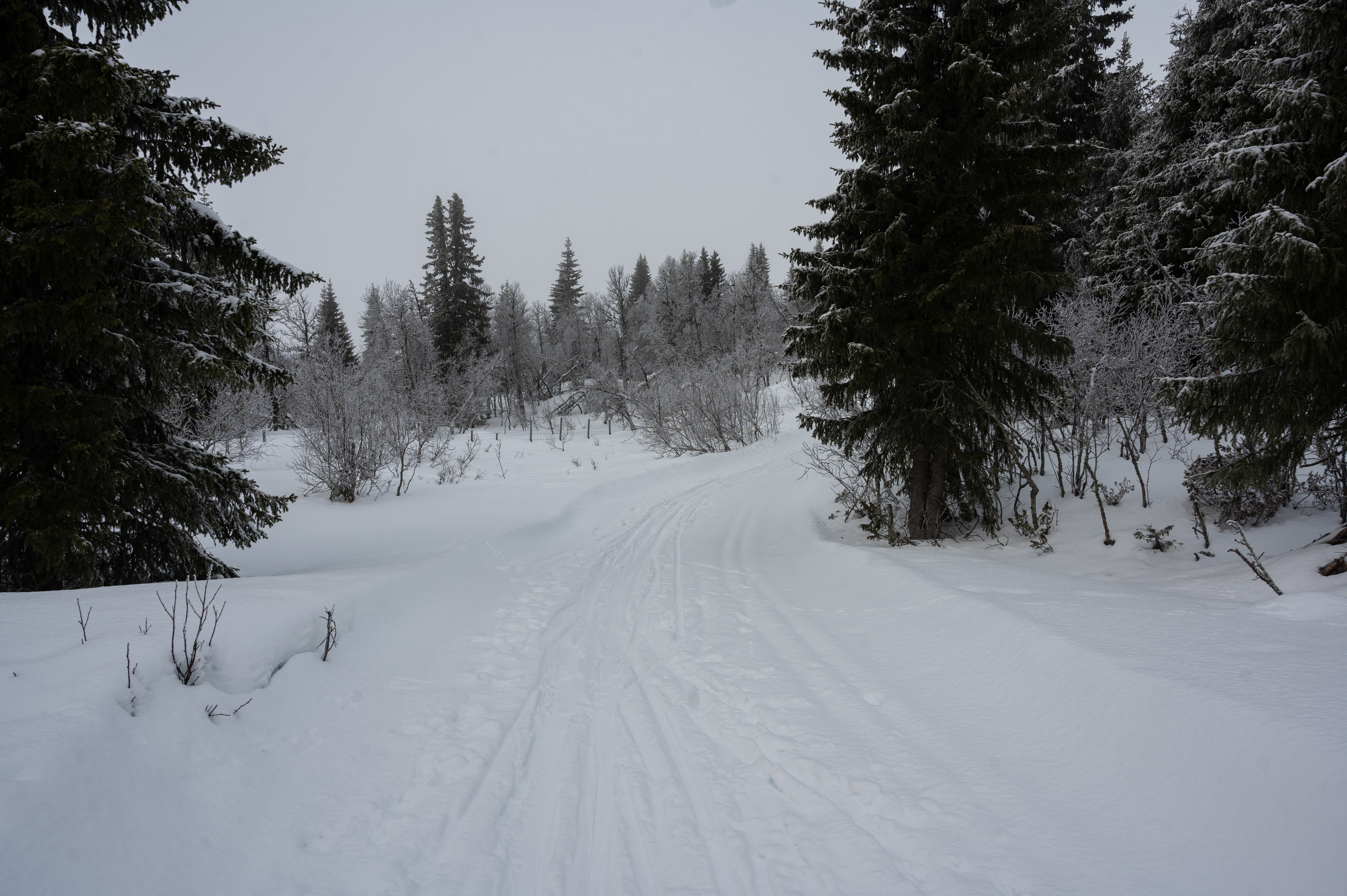 Ich setze mich wieder in Bewegung und folge dem Abzweig nach Rognhaugen. Es geht direkt zwischen ein paar Ferienhäusern den Berg hoch. Das Gelände wird ein wenig hügeliger und verlangt mir die nächsten dreieinhalb Kilometer einiges ab. Dann kommt der letzte Hügel hoch nach Rognhaugen. Ich stehe hier oben am Wegweiser, pfeife gefühlt aus dem letzten Loch und mache eine wohlverdiente Pause. Kurz vor mir sind zwei Langläufer angekommen, die sich, soweit ich es verstehe, über den Weg unterhalten. Ich schlürfe meinen Tee und genieße die Aussicht über das umliegende Gelände. Was mir auffällt, ist, wie wenig Schnee hier in diesem Jahr liegt. Aber das Gefühl hatte ich schon die ganze Zeit unterwegs. Und so sitze ich hier, krame mein Smartphone raus und suche Fotos aus 2020 von dieser Stelle.