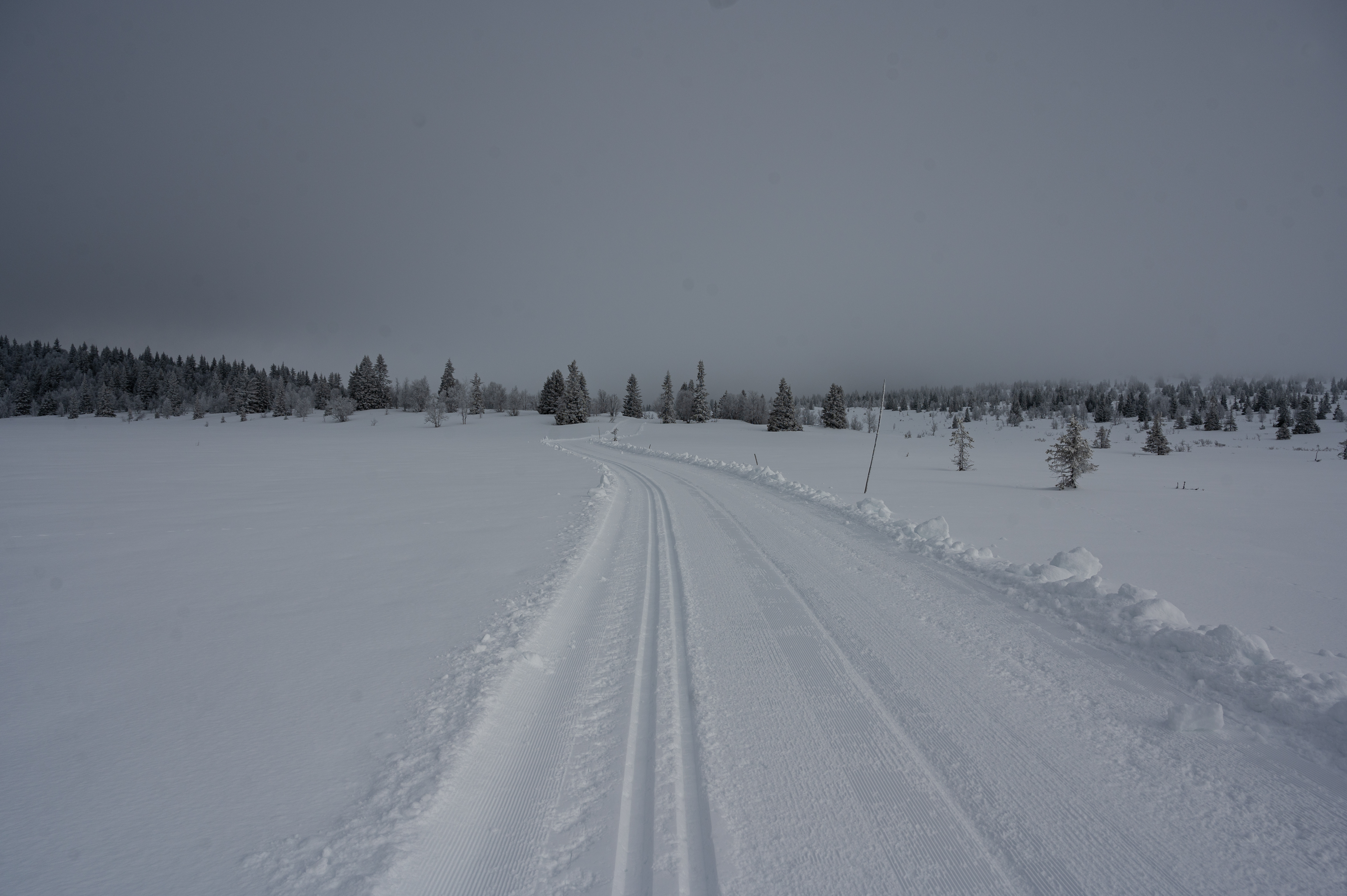 Bei Nysætra angekommen, muss ich feststellen, dass die Loipe wohl diesen Winter nicht bedient wird, und jetzt noch querfeldein zu laufen, darauf habe ich echt nicht mehr den Sinn. Also weiter der Loipe nach und zwei zusätzliche Kilometer auf der Troll-Loipe. So langsam schleppe ich mich auch nur noch über die Piste. Die Luft ist für heute gänzlich raus, die Schulter zieht höllisch, und ich mache drei Kreuze, wenn ich gleich an der Wandervereinshütte angekommen bin. Dann kommt endlich der Abzweig, dem ich nun 4 Kilometer bis zur Straße folge. Irgendwann kommt auch diese in Sicht, und es geht an die letzte Etappe für den Abend. Ich quäle mich die Loipe hoch bis zur Hütte, und witzigerweise habe ich diesen elendigen Anstieg noch genauso in Erinnerung wie bei der letzten Tour.