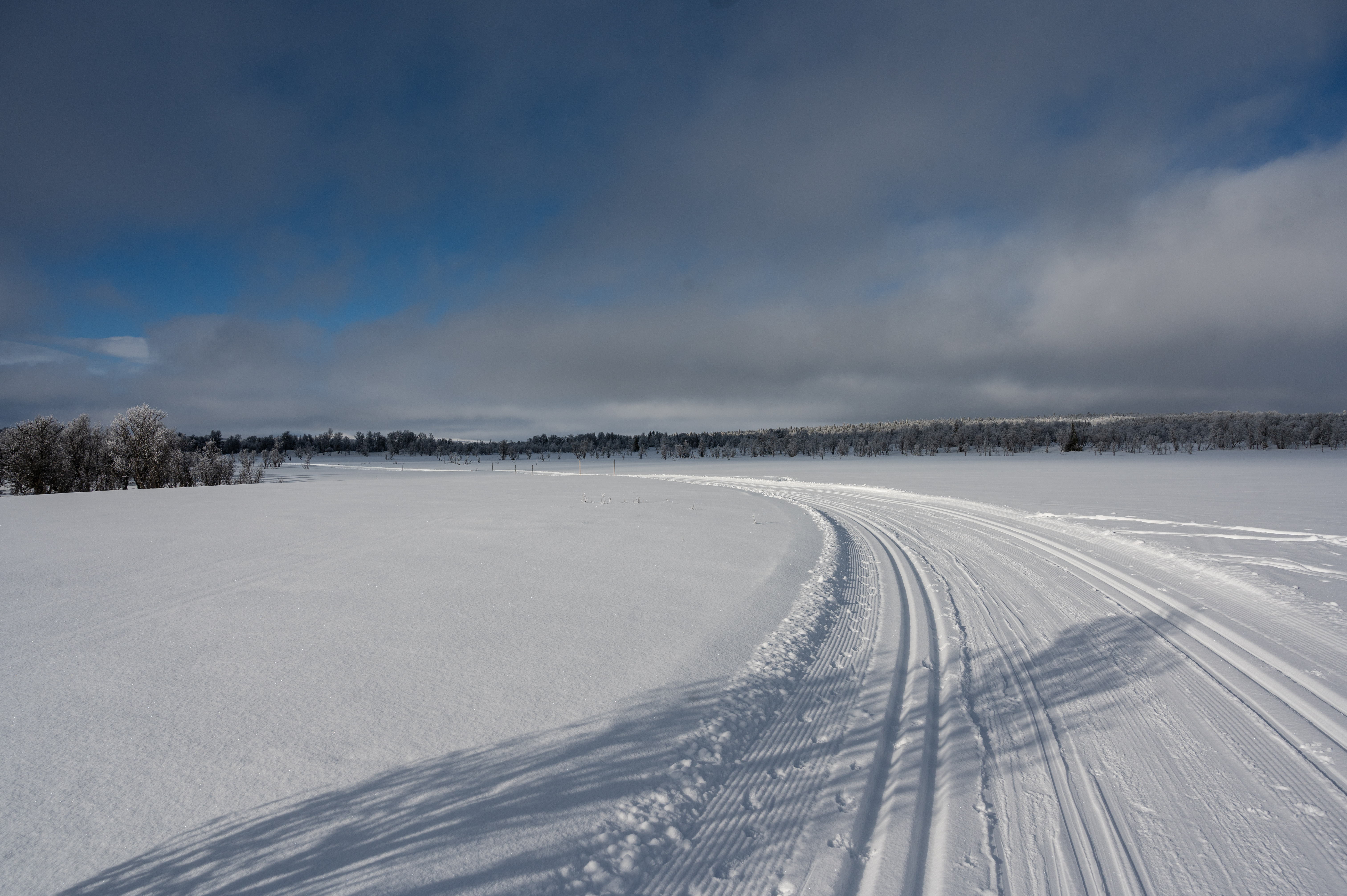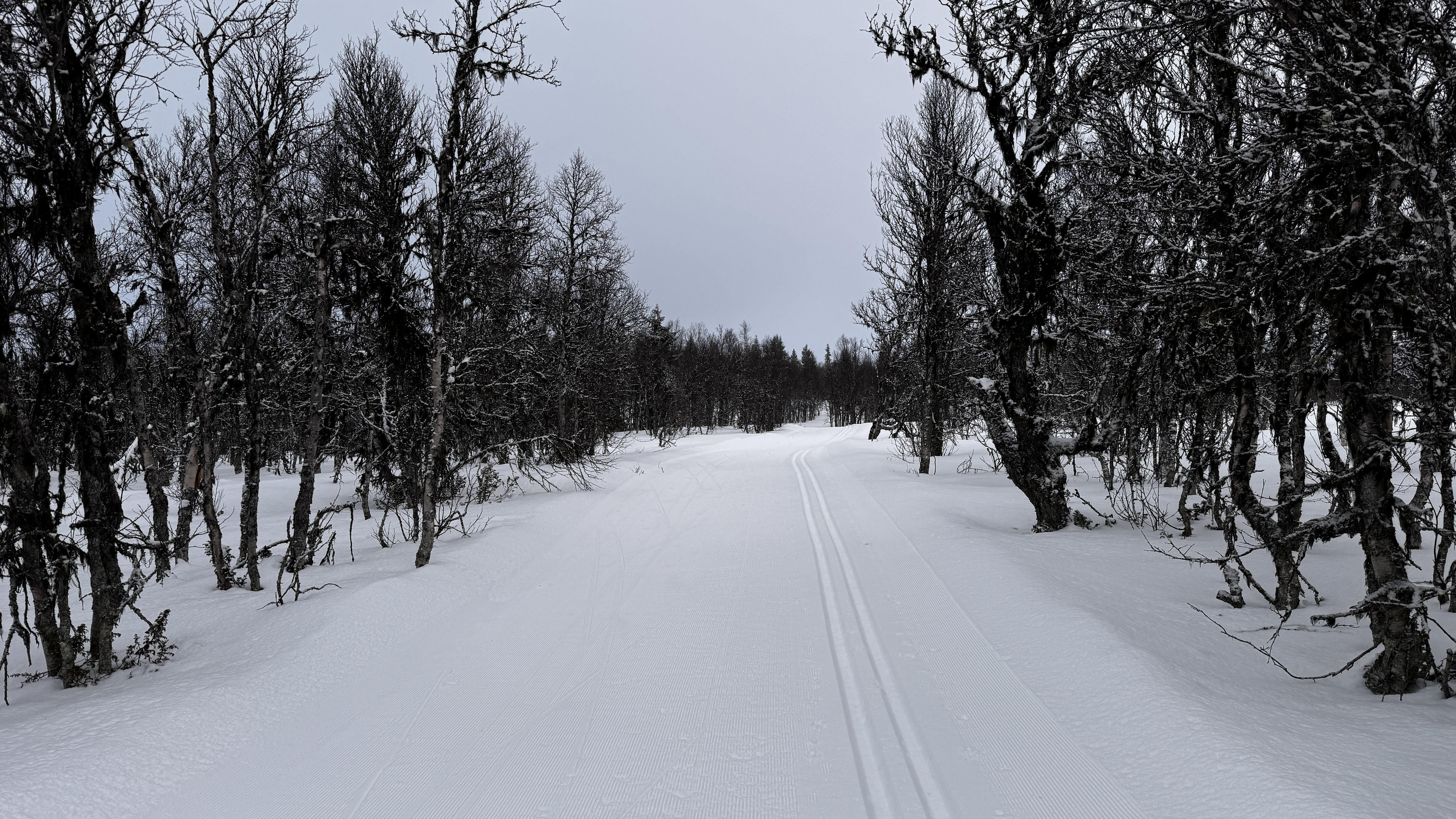 Auf halber Strecke geht es noch einmal kurz durch lichten Birkenwald. Dahinter folgt dann wieder offenes Moor. Die Loipe verläuft nochmals in einer langen Linkskurve, an dessen Ende dann die Vetåbua kommt.