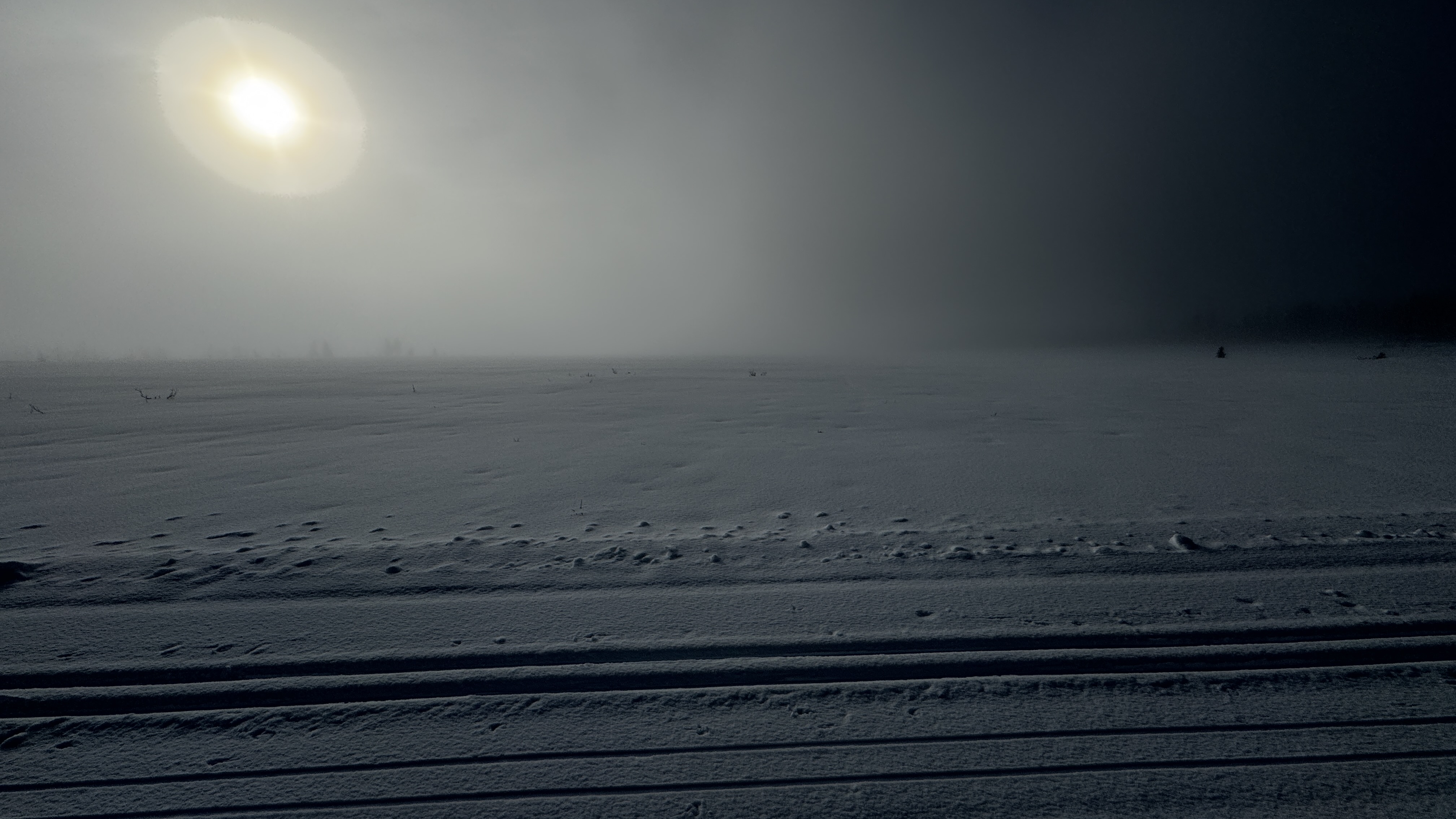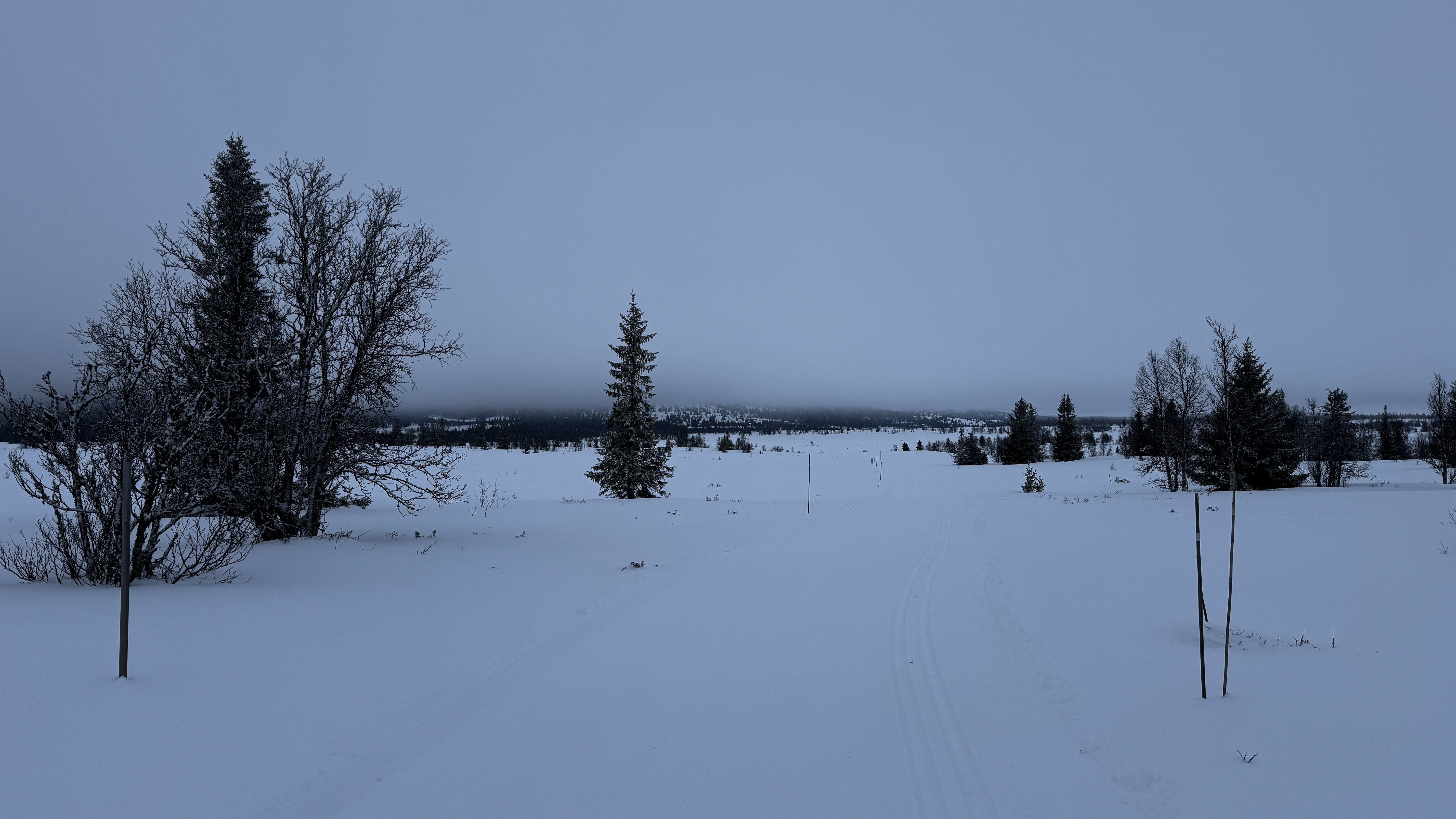 Es geht nun um den Gopollen herum und durch die gleichnamigen Ferienhaussiedlungen Midt und Nord Gopollen. Dann geht es langsam abwärts hinunter zur Gopollmyrene und in einer langen Linkskurve durch das Moor. Die Ski habe ich bereits inmitten der Siedlung abgeschnallt. Die Kurzfelle waren extrem am Stollen. Zu allem Überfluss scheine ich mir am Vortag eine ordentliche Blase zugezogen zu haben. Die hatte ich zwar heute Morgen mit Compeed abgeklebt, aber das scheint nicht geholfen zu haben. Bis zur nächsten Hütte, der Vetåbua, sind es keine 3 km mehr, und ich folge der Loipe langsam. Endlich kommt auch die Sonne raus und dieser graue Dunst verzieht sich.