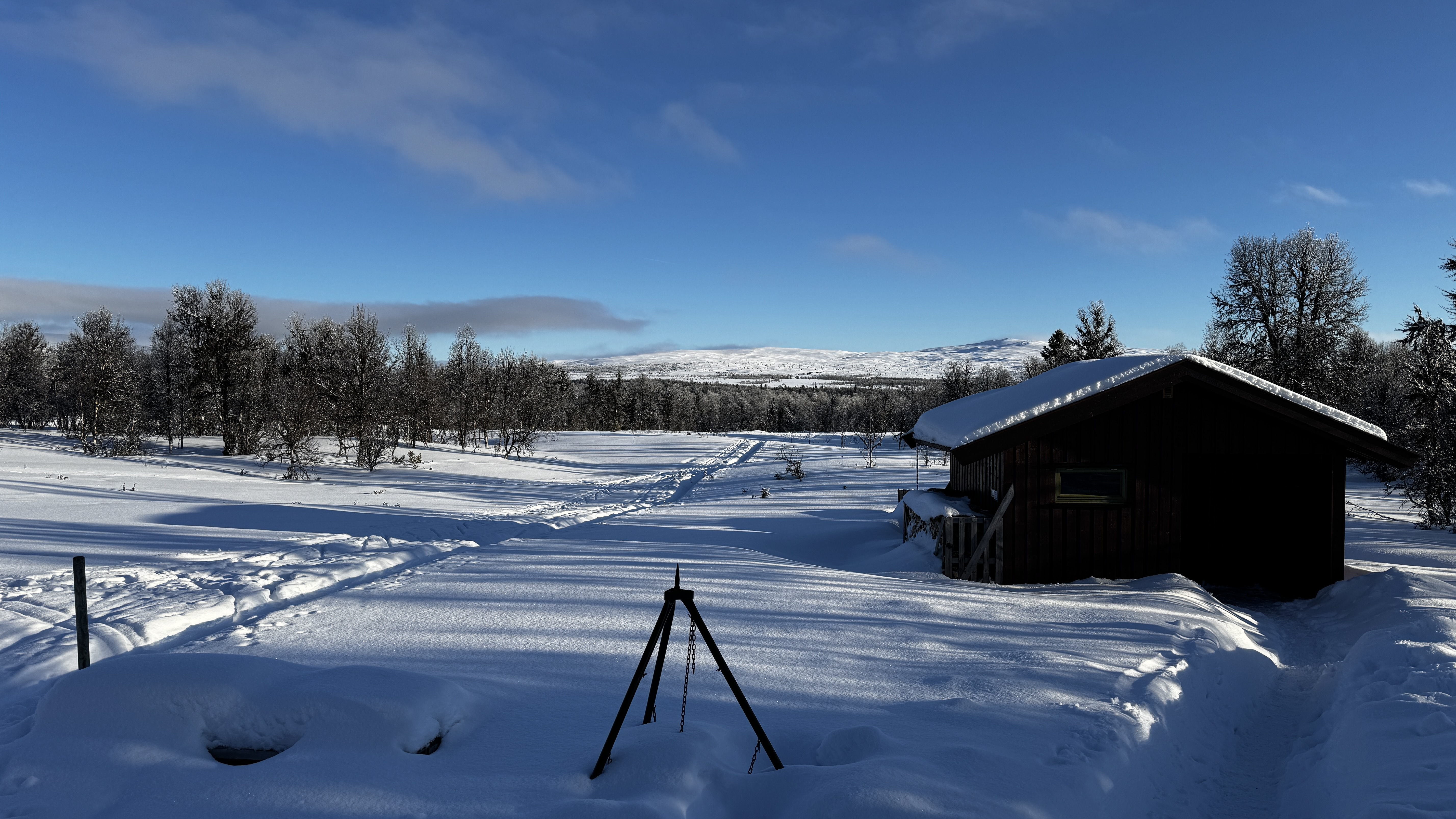 Gut 20 Minuten später stehe ich an der Weggabelung zur DNT-Hütte. Ich folge dem schmalen Pfad durch die Hüttenansammlung hindurch zur Haupthütte. Die Hütte scheint mir komplett allein zu gehören. So heize ich erst einmal den Ofen ein, hole ordentlich Brennholz aus dem Lager und fülle das Wasser auf. Dann gibt es eine Tasse heiße Schokolade, mit der ich mich draußen auf die Bank setze und die fantastische Aussicht zum Gopollen hinüber genieße.